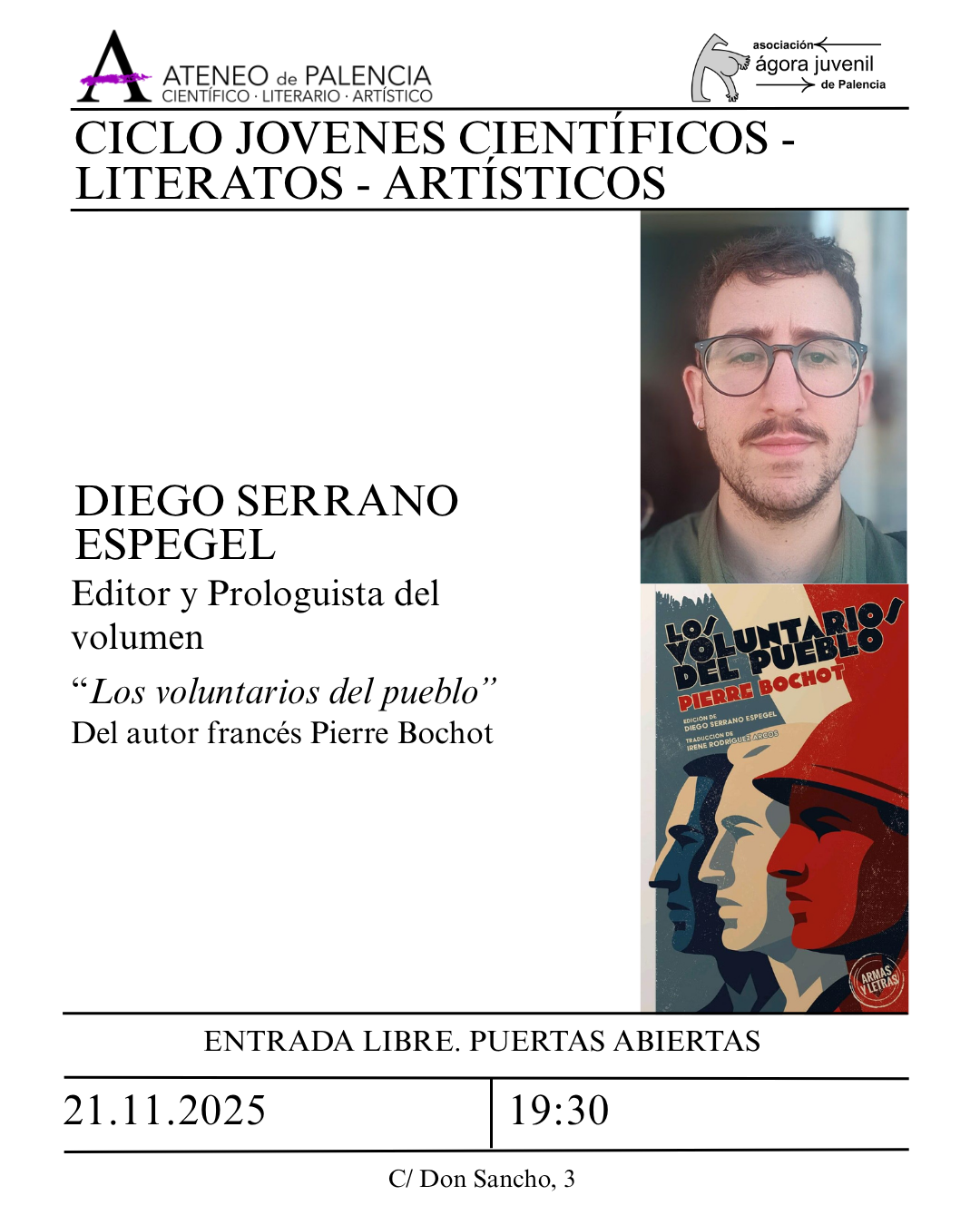 CICLO JOVENES CIENTÍFICOS- LITERATOS – ARTÍSTICOS – DIEGO SERRANO ESPEGEL CICLO JOVENES CIENTÍFICOS- LITERATOS – ARTÍSTICOS – DIEGO SERRANO ESPEGEL + Añadir Google Calendar Exportación + iCal / Outlook Fecha Nov 21 2025 Finalizdo! Hora 19:30 Categoría Noviembre 2025 Compartir este evento