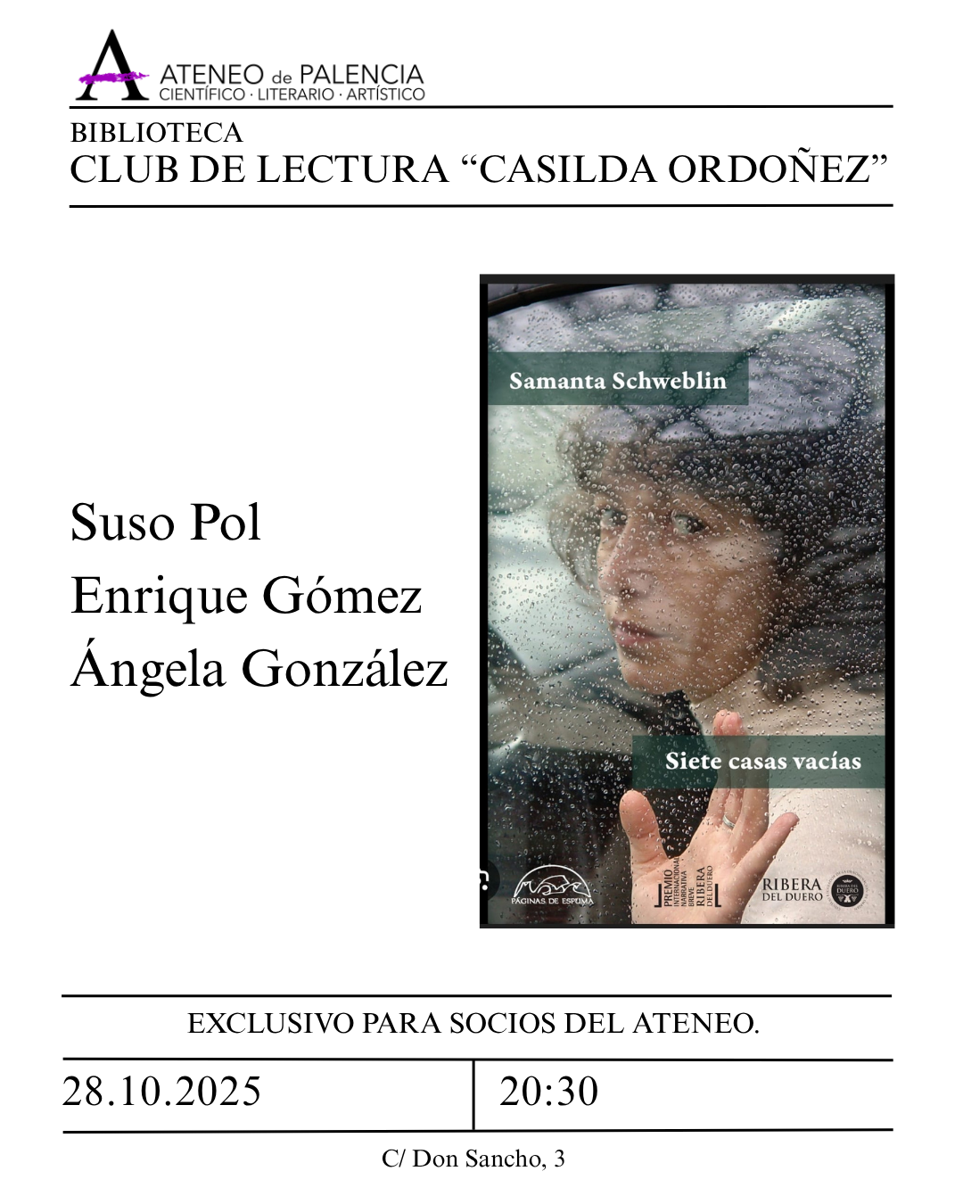 CLUB DE LECTURA «CASILDA ORDOÑEZ» + Añadir Google Calendar Exportación + iCal / Outlook 00 días 00 horas 00 minutos 00 segundos Fecha Oct 28 2025 Hora 20:30 Categoría Octubre 2025 Compartir este evento