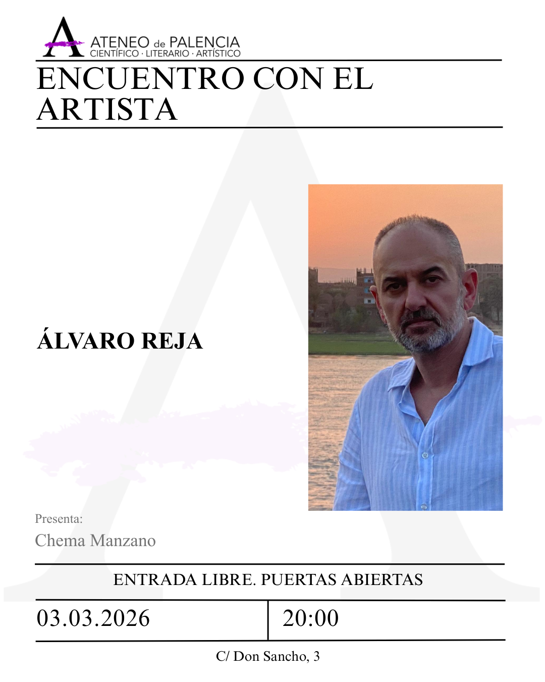 ENCUENTRO CON EL ARTISTA – Álvaro Reja ENCUENTRO CON EL ARTISTA – Álvaro Reja + Añadir Google Calendar Exportación + iCal / Outlook El evento está terminado. Fecha Mar 03 2026 Finalizdo! Hora 20:00 Localización Nueva Sede Ateneo de Palencia Calle Don Sancho, 3 Categoría Marzo 2026 Compartir este evento