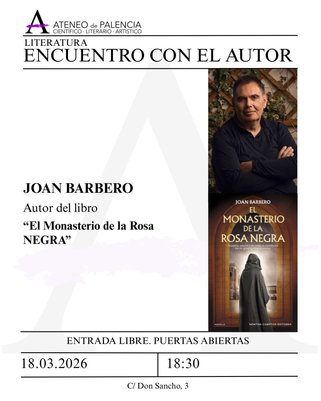 ENCUENTRO CON EL AUTOR – Joan Barbero – «El Monasterio de la Rosa Negra» ENCUENTRO CON EL AUTOR – Joan Barbero – «El Monasterio de la Rosa Negra» + Añadir Google Calendar Exportación + iCal / Outlook 00 días 00 horas 00 minutos 00 segundos Fecha Mar 18 2026 Hora 18:30 Localización Nueva Sede Ateneo de Palencia Calle Don Sancho, 3 Categoría Marzo 2026 Compartir este evento