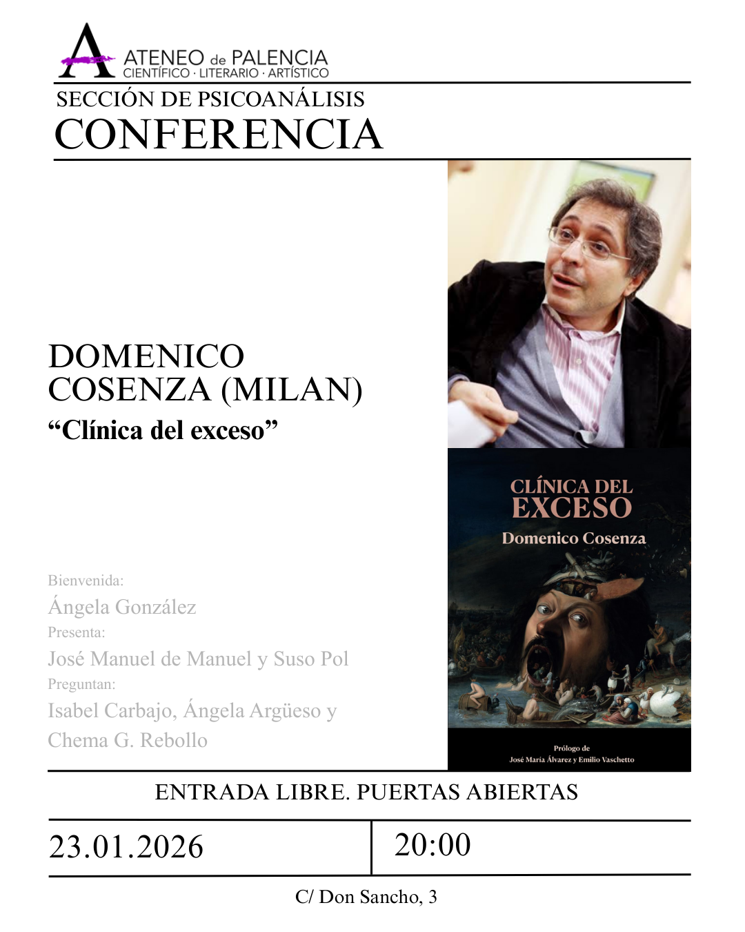 SECCIÓN DE PSICOANÁLISIS – Conferencia – Domenico Cosenza (Milan) – «Clínica del exceso»