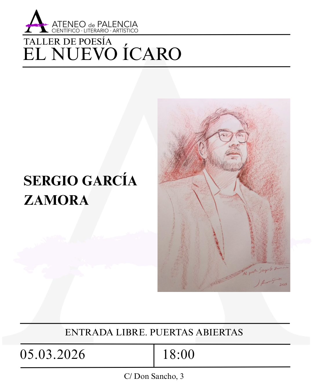 TALLER DE POESÍA – «El nuevo Ícaro» – Sergio García Zamora TALLER DE POESÍA – «El nuevo Ícaro» – Sergio García Zamora + Añadir Google Calendar Exportación + iCal / Outlook 00 días 00 horas 00 minutos 00 segundos Fecha Mar 05 2026 Hora 18:00 Localización Nueva Sede Ateneo de Palencia Calle Don Sancho, 3 Categoría Marzo 2026 Compartir este evento